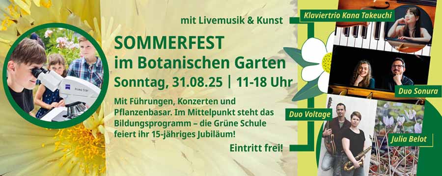Das Sommerfest ist die bedeutendste Veranstaltung im Jahresprogramm des Botanischen Gartens. Es wurde erstmals im August 2001 ausgerichtet und entwickelte sich schnell zum Publikumsliebling. Mit stimmungsvollen Konzerten, einem gut besuchten Pflanzenbasar und einer einmaligen Atmosphäre war es über viele Jahre hinweg ein voller Erfolg. Nun – 25 Jahre nach seiner Premiere – feiern wir das Comeback dieses besonderen Festes.