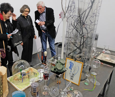 v.r.n.l. Kulturstadtrat Helmut Nehrbaß im Gespräch mit der Künstlerin Sofi Zezmer und der Kulturjournalistin Dorothea Baer-Bogenschütz vor einem Sammelsurium-Tisch mit vergänglichen Alltags-Dingen, deren Verwertung einen möglichen Zusammenhang zwischen Gegenstand und dem gesellschaftlichen Wertesystem symbolisieren. Zezmer Installation erinnert mich ein wenig an das täglich liebevoll neu präsentierte Spielzeug- und Tinnef-Mini-Land von "Eisenbahn-Reiner", der hierüber kommuniziert in eine ihm ansonsten verschlossene Welt. Seit man ihn 2017 beklaute, ist er wohl Frankfurts bekanntester Obdachloser. Bei jedem Wetter trotzt er zwischen Hauptwache und Römer vor dem Franziskustreff im Schäfergässchen ganz real brutal seiner und seiner Habseligkeiten  Vergänglichkeit. © Foto: Diether v. Goddenthow