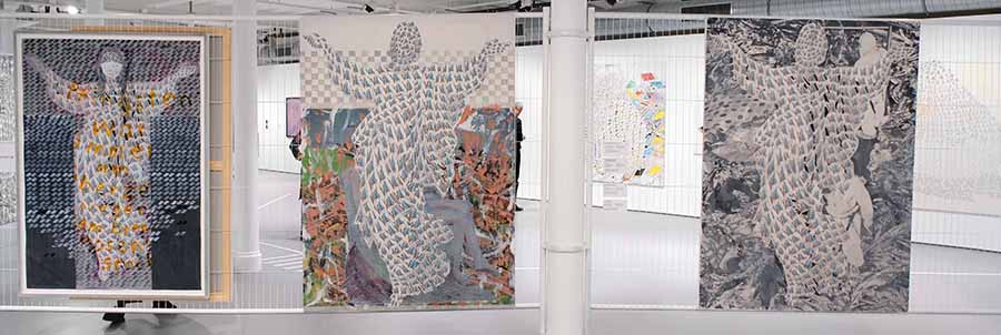 Monets Heuschober erscheinen in Heuhaufen Marmoriert und Roll Over Smartfon I (beide 2019) als Konstruktionen aus iPhones. Masaccios Vertreibung aus dem Paradies wird in Brancacci Chapel (2020) mit zeitgenössischen Bildquellen gefüllt – salutierende Frauen und protestierende Männer strukturieren Adam und Eva. In Vertreibung aus dem Paradies (2020) hingegen befinden sich die Figuren erneut in einer üppigen Pflanzenwelt, als hätten sie das Paradies nie verlassen.