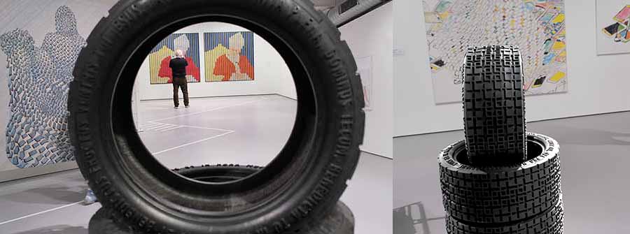 In Weberei / Weaving (2010) verschränken sich Fahrbahnen zu einer Fusion von Straße und Stoff – ein Verweis auf das „soziale Gewebe“ und auf Bayrles Ausbildung am Jacquard-Webstuhl. Dessen binäres Lochkartensystem gilt als Vorläufer der digitalen Datenverarbeitung. Für Bayrle sind die einzelnen Fäden Individuen, die gemeinsam das Kollektiv bilden.