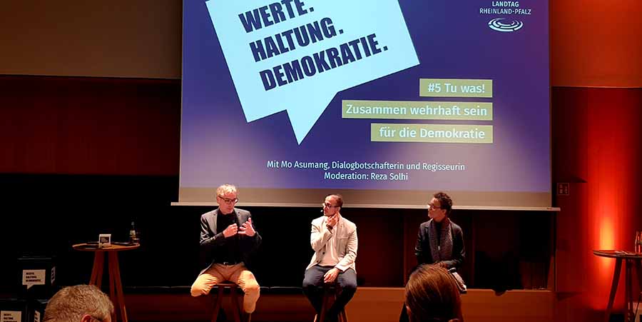 Die Abschlussveranstaltung „Zusammen wehrhaft sein für die Demokratie“ widmete sich der Frage, wie jede und jeder Einzelne Zivilcourage zeigen kann. Als Expertin war Mo Asumang eingeladen – Dialogbotschafterin, Antirassismus-Aktivistin, Regisseurin, Moderatorin und Filmproduzentin. Sie berichtete von ihren persönlichen Erfahrungen sowie ihrem Engagement für eine respektvolle Dialogkultur und diskutierte darüber mit Landtagspräsident Hendrik Hering.