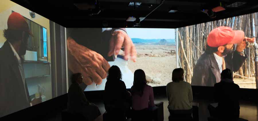 Im Zentrum der Ausstellung steht eine von Wim Wenders selbst konzipierte immersive Installation im zweiten Obergeschoss des Museums. In einem hexagonal angelegten Raum hat er auf mehreren Projektionsflächen Bild- und Klangwelten aus seinen wichtigsten Filmen zusammengeführt. Die Besucherinnen und Besucher sitzen in der Mitte und erleben die Szenen anders als im Kino: nicht aus einer festen Perspektive, sondern gleichzeitig aus mehreren Blickwinkeln — oder, wie Wenders es nennt, „kubistisch“. Die rund 30-minütige Projektion beginnt anschließend automatisch erneut.