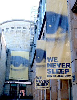 „We Never Sleep“ beleuchtet das Thema der Spionage durch das Prisma zeitgenössischer Kunst und Gestaltung. Die Kunstwerke und Objekte der Ausstellung werden in der Architektur von Adrien Rovero als immersives Environment inszeniert.