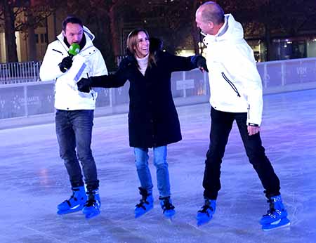 Astrid Wallmann auf dem Eis in sicheren Händen von FFH-Moderator Tobias Radloff und Stadtverordnetenvorsteher Dr. Gerhard Obermayr, © Foto Diether von Goddenthow