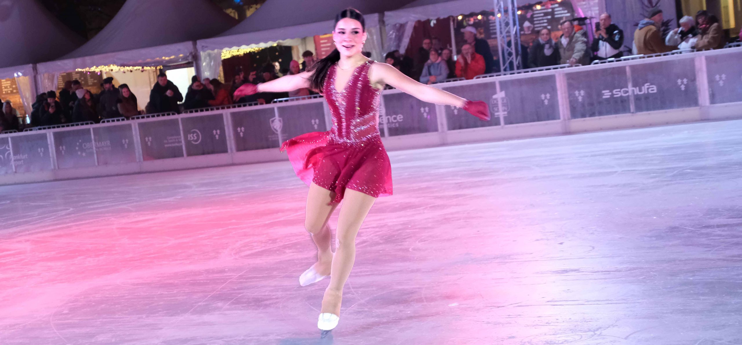 Ein besonderer Höhepunkt der feierlichen Eröffnung waren die poetischen Eiskunst-Darbietungen von „butterflies on ice“, dem Eiskunstlauf-Ensemble der Ice Academy Mainz. Mit anmutigen Pirouetten und eleganten Formationen verwandelten sie die kalte Fläche in eine Bühne für winterliche Träume. In ihren Soloparts glänzten anschließend die jungen Talente: Marie Bangert, Hessenmeisterin der Jugend-Damen, begeisterte mit einer makellos vorgetragenen schnellen fantasievollen Kür, während Lorin Deli, Deutsche Meisterin der Jugend Damen A, mit rasant gezogenen Bögen und ausdrucksstarken Figuren das Publikum in ihren Bann zog.