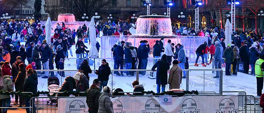 Seit einer Woche läuft „Wiesbaden on Ice“ im regulären Betrieb – und die Bilanz kann sich sehen lassen: Bereits 18.500 Buchungen für Eiszeiten und Eisstockbahnen verzeichnet die spektakuläre Winterattraktion auf dem Bowling Green. Mit ihren 2.500 Quadratmetern zählt sie zu den größten mobilen Eisbahnen Deutschlands und zieht auch in diesem Jahr zahlreiche Besucher an.