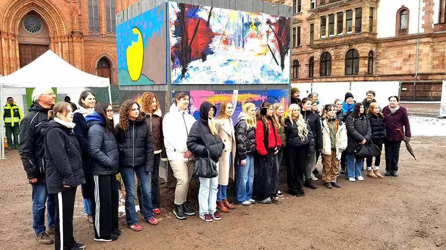 Wiesbaden, 19. Februar 2026 – Farbe bekennt, Kunst verbindet und ein Denkmal wird zur Bühne junger Kreativität: Heute Vormittag sind auf dem Wiesbadener Schlossplatz die großformatigen Kunstwerke der Schülerinnen und Schüler des Kunst-Leistungskurses des Gymnasiums Michelstadt und der IGS Alexej von Jawlensky Schule am aufgrund von Bauarbeiten verhüllten Denkmal Wilhelms von Oranien feierlich enthüllt worden. Gemeinsam mit Landtagspräsidentin Astrid Wallmann sowie den Stadträtinnen Bettina Gies und Christine Jouax-Frönd erlebten die beteiligten Schülerinnen und Schüler den bewegenden Moment, in dem ihre Werke erstmals der Öffentlichkeit präsentiert wurden.