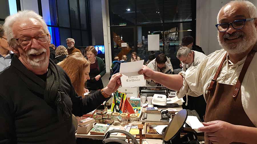 Der Kooperationspartner Gutenberg-Museum bot unter anderem die Möglichkeit an, unter fachkundiger Anleitung eine Weihnachtskarte mit der Aufschrift „Merry Christmas“ auf echtem Büttenpapier zu drucken. © Foto: Diether v Goddenthow